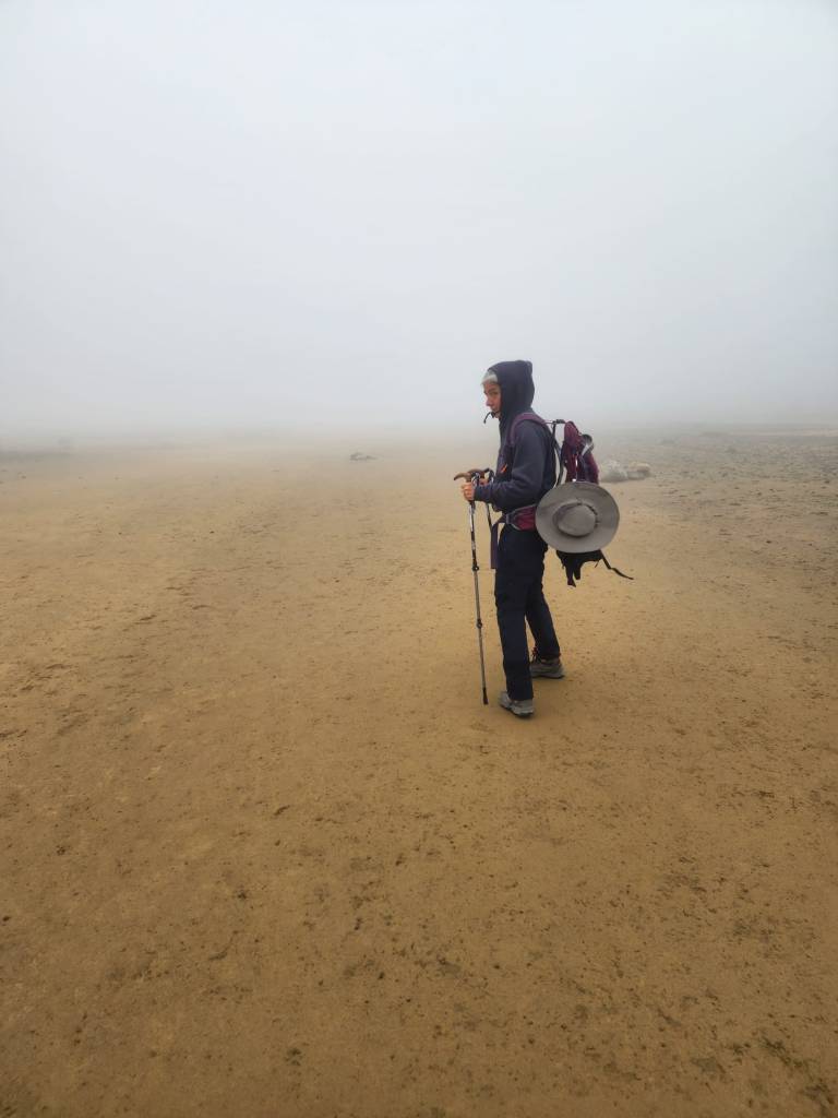 כשהגענו לפסגת ההר, אכלנו בזריזות ארוחת בוקר, והמשכנו ללכת על הירח. לוטים בערפל.